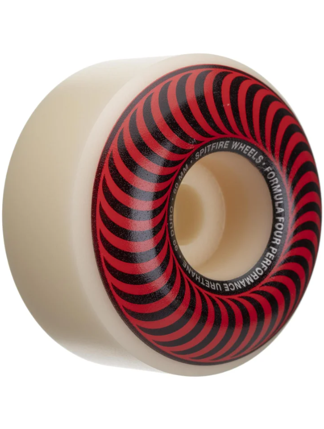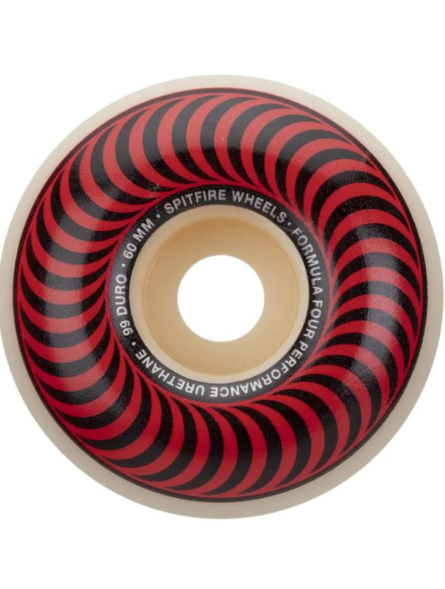 Ride the fire through the streets with the newly introduced, Spitfire Formula 4 Classic 99a Wheels. Designed with your favorite classic Spitfire Classic wheel designs and manufactured with the quality high performance, Formula Four urethane. Formula Four Urethane lasts longer, withstands more abuse and performs superior to all other wheels. Designed to combine all the desired properties of a performance wheel without sacrificing any one attribute at the expense of another. Manufactured using a 100% pure urethane compound, Formula Four wheels out-performed and resisted flat spots longer with less wear than all other wheels. Higher rebound for faster speeds over rough and smooth surfaces with a hard durometer for a smoother, faster ride that won't mush out over time. Designed with an exclusive anti-stick compund that gives a fast/consistent, smooth slide all the way through.